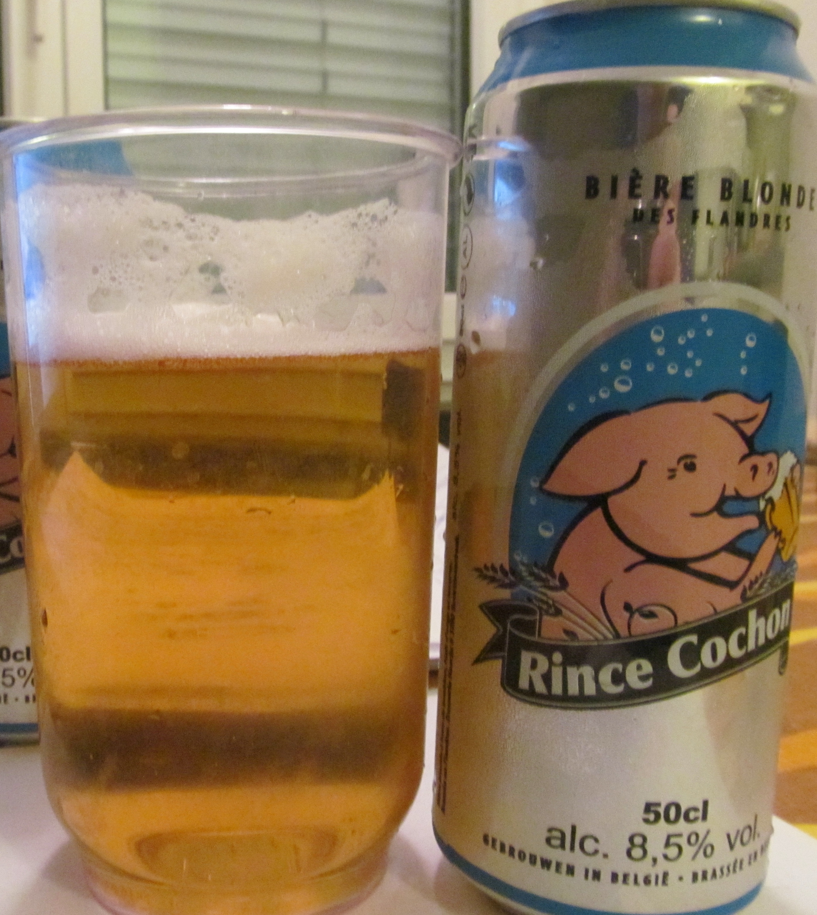 Rince Cochon was a French lager that was originally brewed by the Annoeullin brewery, then was taken to Belgium and brewed, firstly, by the Huyghe Brewery, but now brewed by the Haacht Brewery in Flanders. The Haacht brewery is an independent family run operation that has stood for over a hundred years.